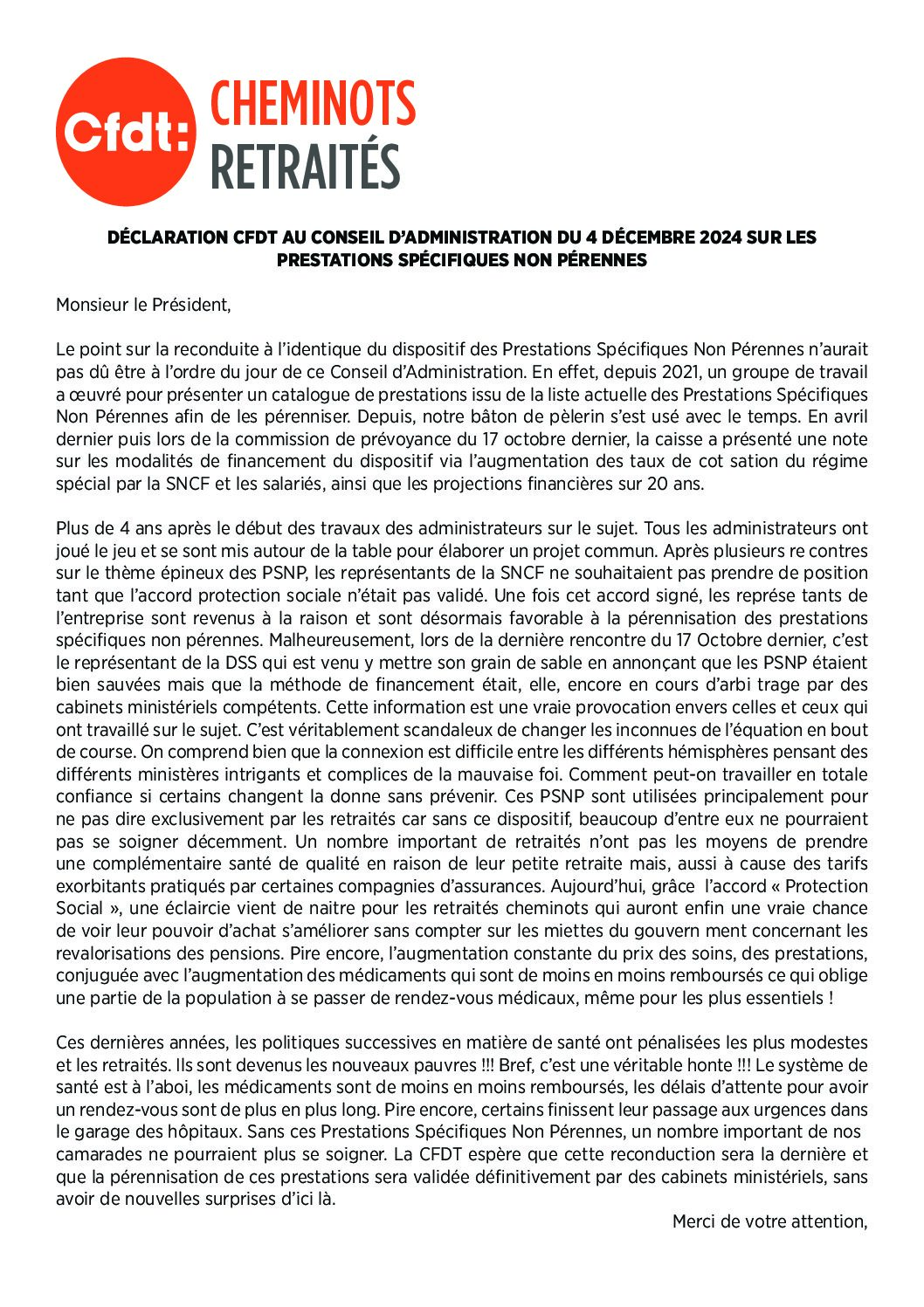 • Déclaration CFDT au Conseil d’Administration du 4 décembre 2024